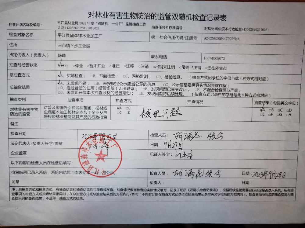 平江县林业局对林业有害生物防治的监管双随机检查记录表