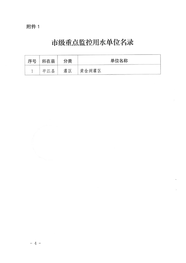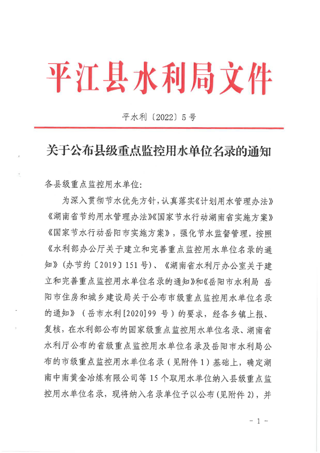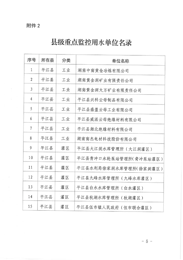 平江县关于公布县级重点监控用水单位名录的通知