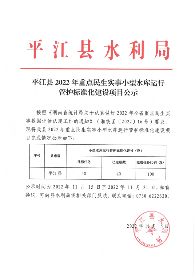 平江县2022年重点民生实事小型水库运行管护标准化建设项目公示
