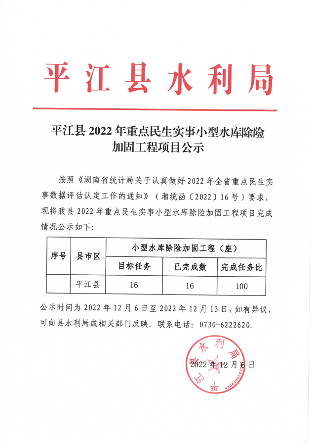 平江县2022年重点民生实施小型水库除险加固工程项目公示