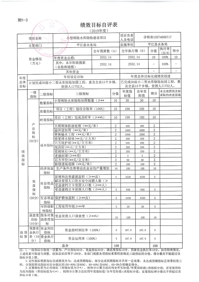 2019年小型病险水库除险加固项目绩效目标自评表