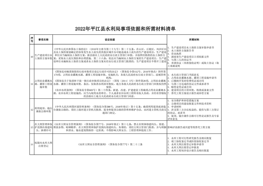 2022年平江县水利局事项依据和所需材料清单