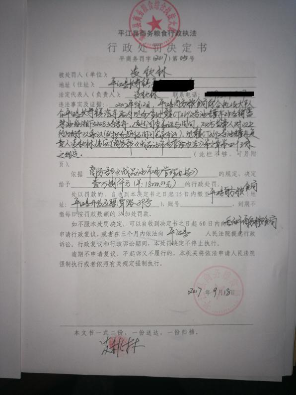 平商务罚字(2017)第05号:平江县商务粮食局行政处罚决定书