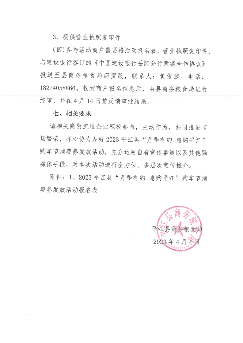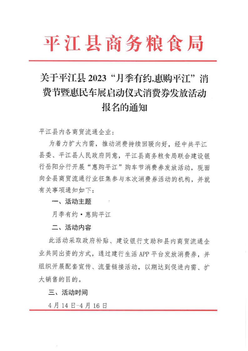 关于平江县2023“月季有约.惠购平江”消费节暨惠民车展启动仪式消费券发放活动报名的通知