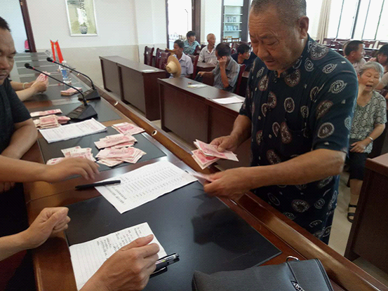 7月19日上午9点整,平江县审计局结对帮扶的石牛村村部会议室里喜气洋洋,一场别开生面的会议正在进行:在《广福源公司暨广惠源产业帮扶分红推进会》的大红会标映衬下,前台的办公桌上摆放着现金,35名贫困户在听到自己的名字后,依次上台签字,当场从工作人员手中领到了一笔产业扶贫红利……