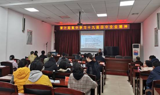 11月30日下午,县审计局组织全局干部职工集中学习贯彻党的十九届四中全会精神,邀请县委宣传部副部长余庆东作宣讲报告。