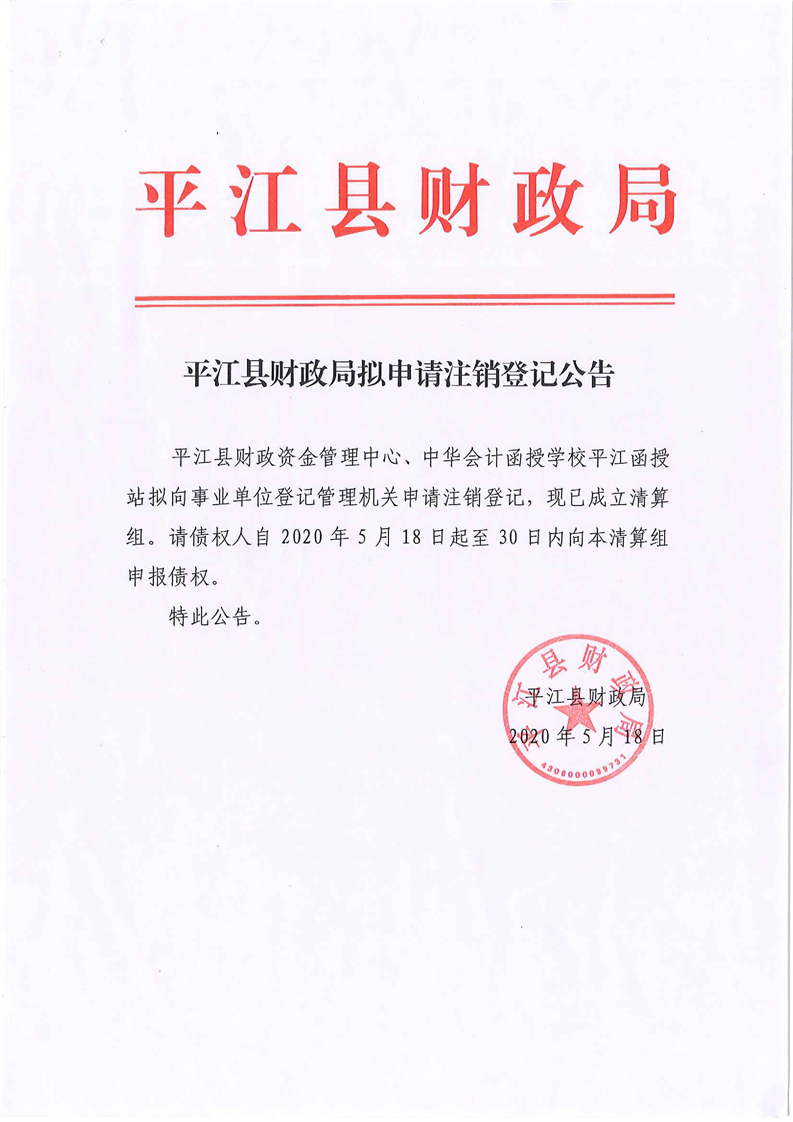 平江县财政局拟申请注销登记公告