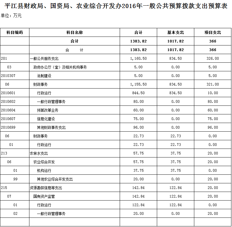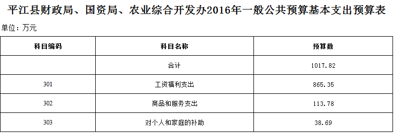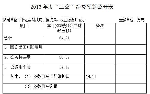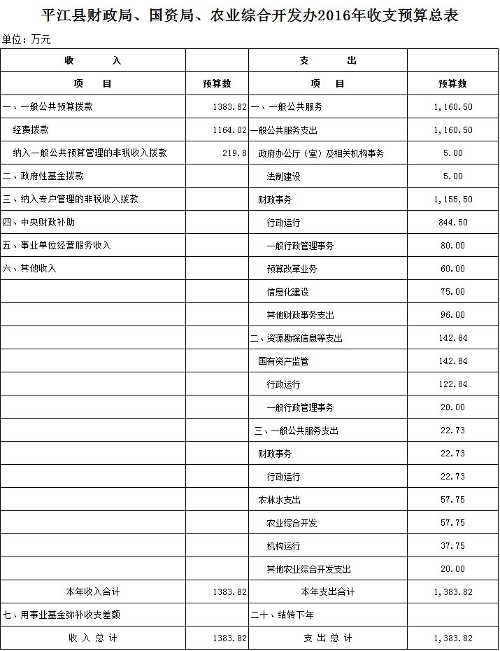 平江县财政局、国资局、农业综合开发办2016年收支预算总表