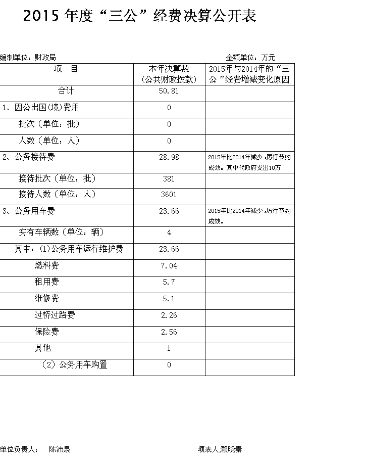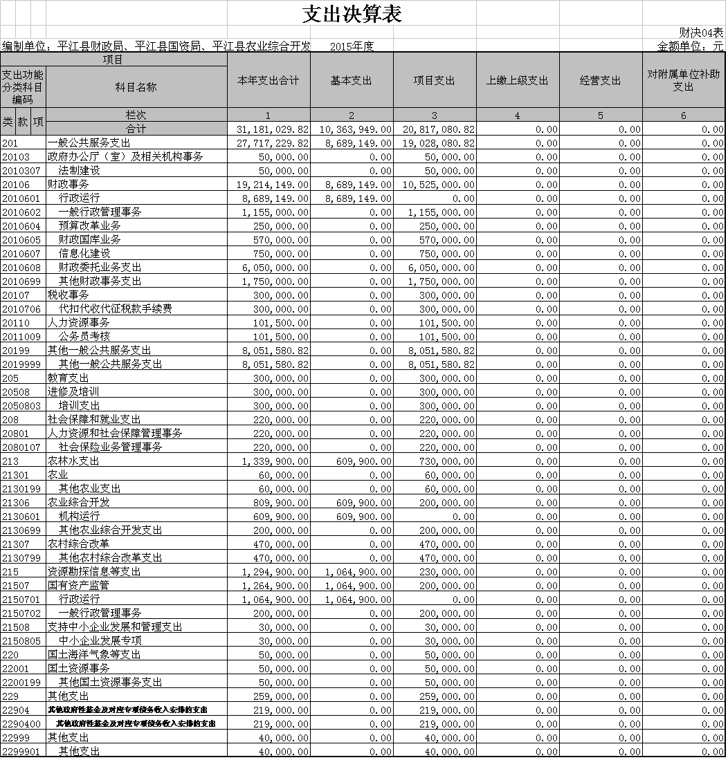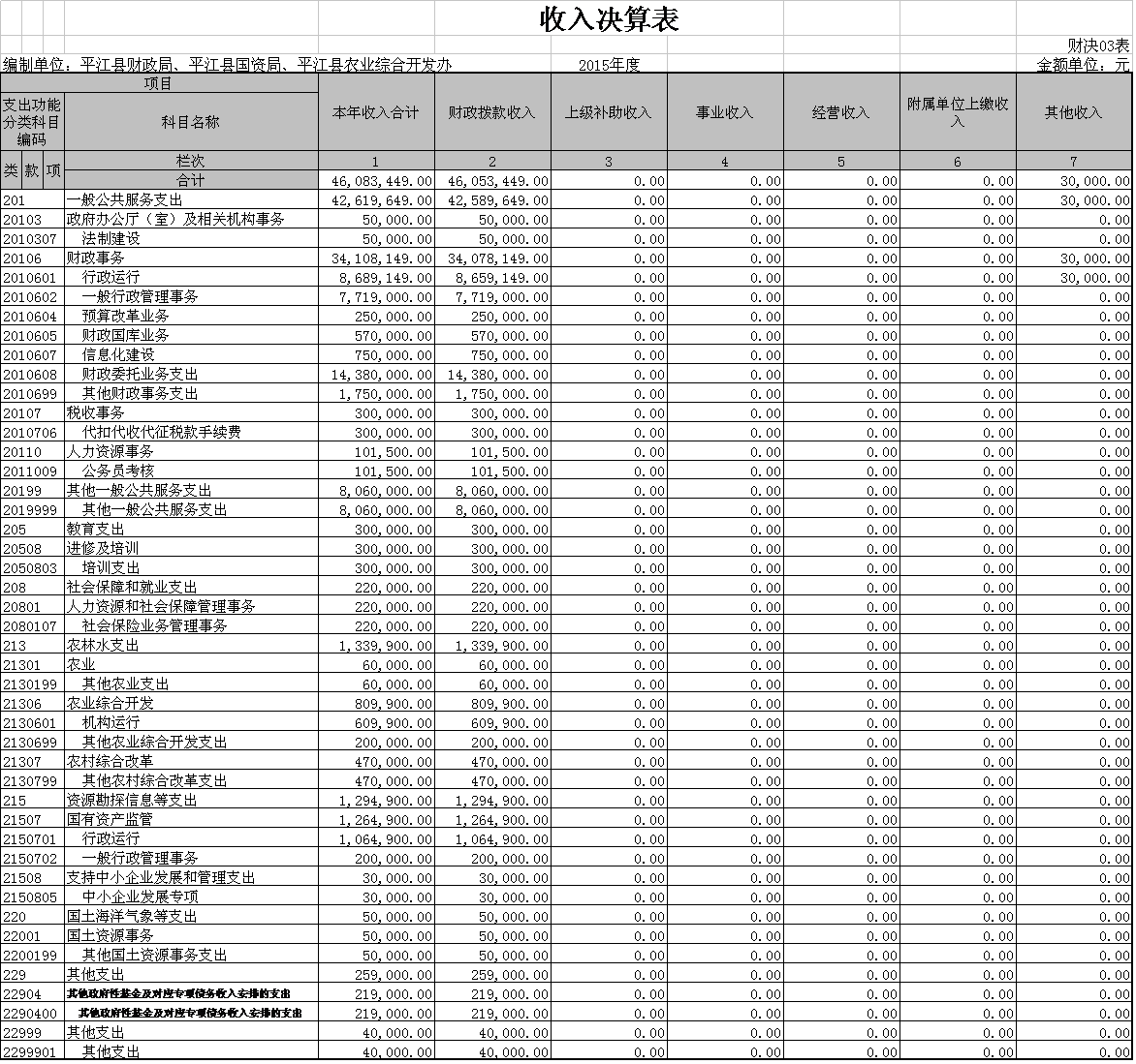 2015年决算报表包含平江县财政局、平江县国有资产管理局,平江县农业综合开发办三个单位的决算数据 , 单位性质是全额一级预算行政事业单位,执行行政事业单位会计制度。