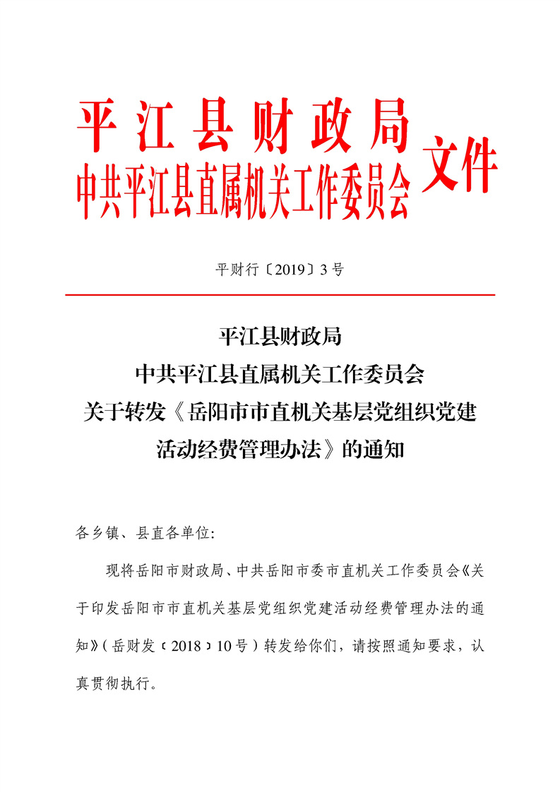 平江县财政局中共平江县直属机关工作委员会关于转发《岳阳市市直机关基层党组织党建活动经费管理办法》的通知