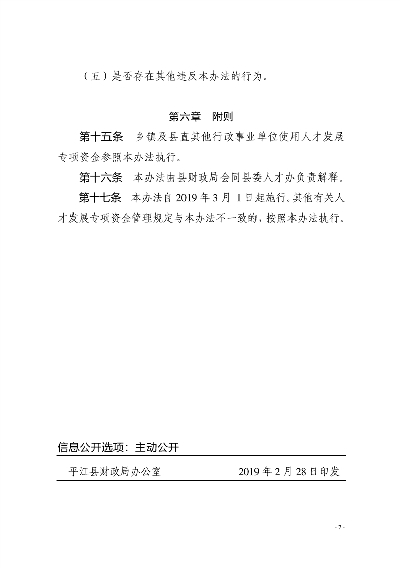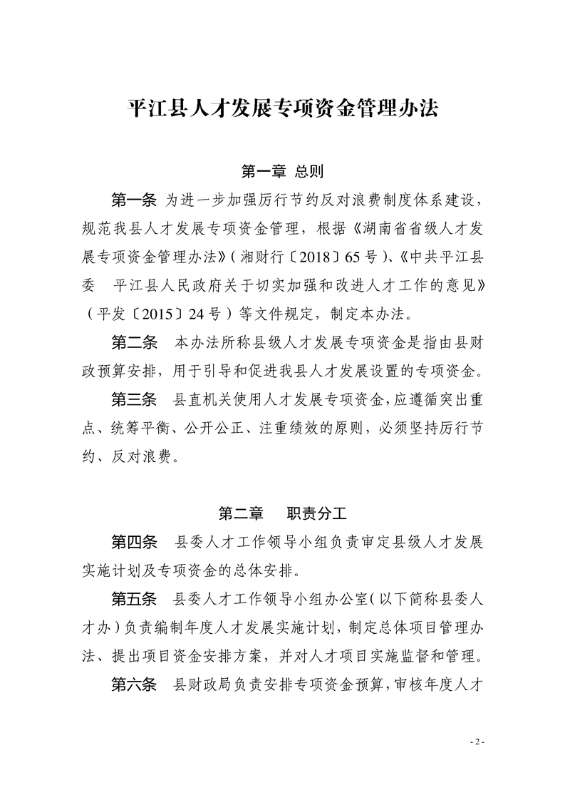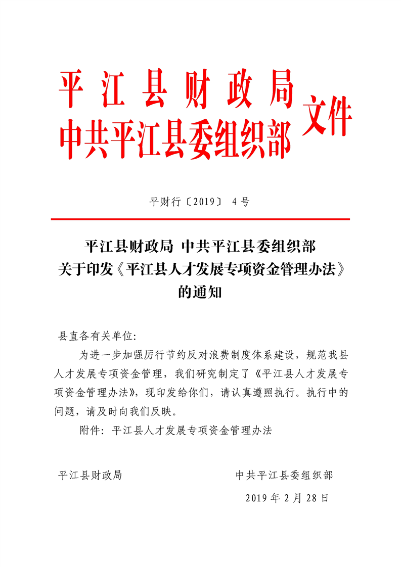 平江县财政局中共平江县委组织部关于印发《平江县人才发展专项资金管理办法》的通知