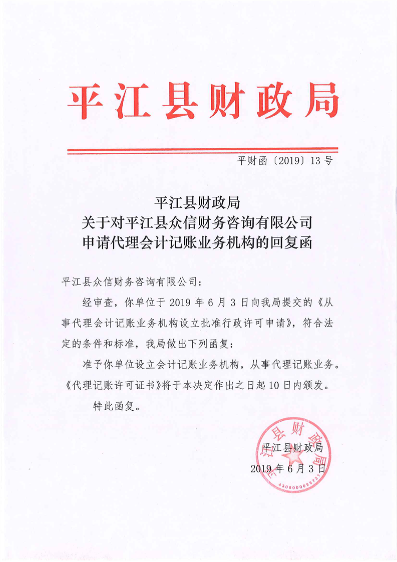 平江县财政局关于对平江县众信财务咨询有限公司申请代理会计记账业务机构的回复函