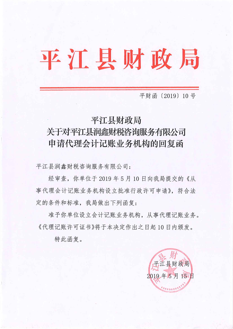 平江县财政局关于对平江县润鑫财税咨询服务有限公司申请代理会计记账业务机构的回复函
