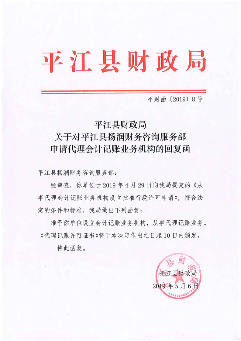 平江县财政局关于对平江县扬润财务咨询服务部申请代理会计记账业务机构的回复函