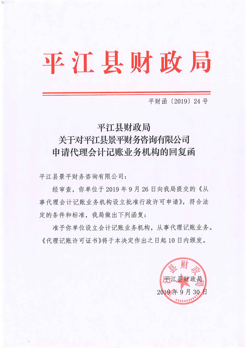 平江县财政局关于对平江县景平财务咨询有限公司申请代理会计记账业务机构的回复函