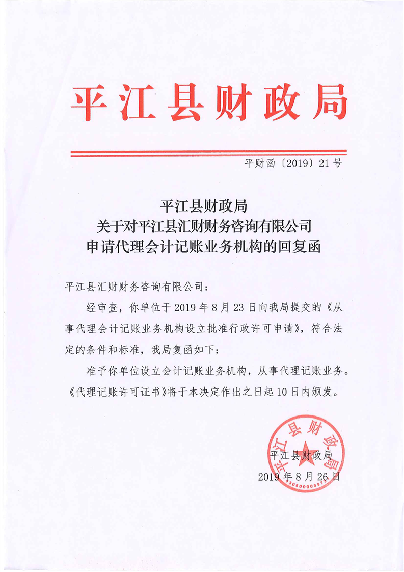 平江县财政局关于对平江县汇财财务咨询有限公司申请代理会计记账业务机构的回复函