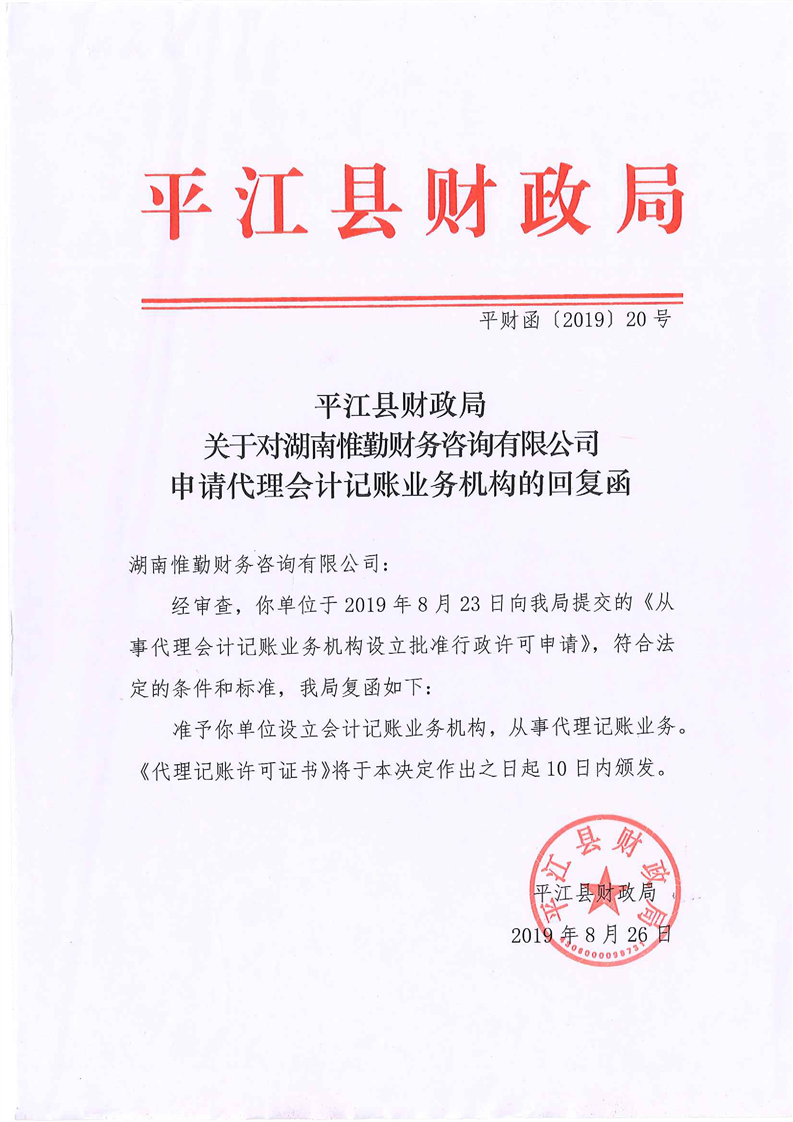 平江县财政局关于对湖南惟勤财务咨询有限公司申请代理会计记账业务机构的回复函