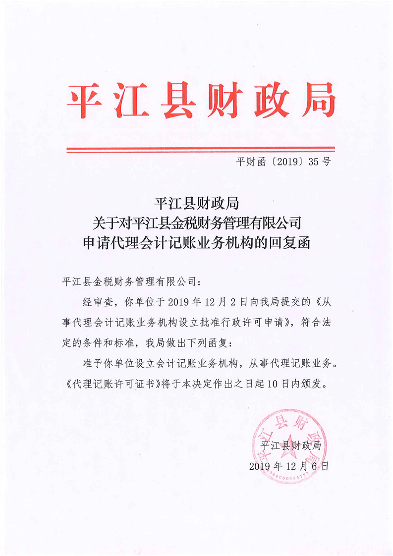 平江县财政局关于对平江县金税财务管理有限公司申请代理会计记账业务机构的回复函