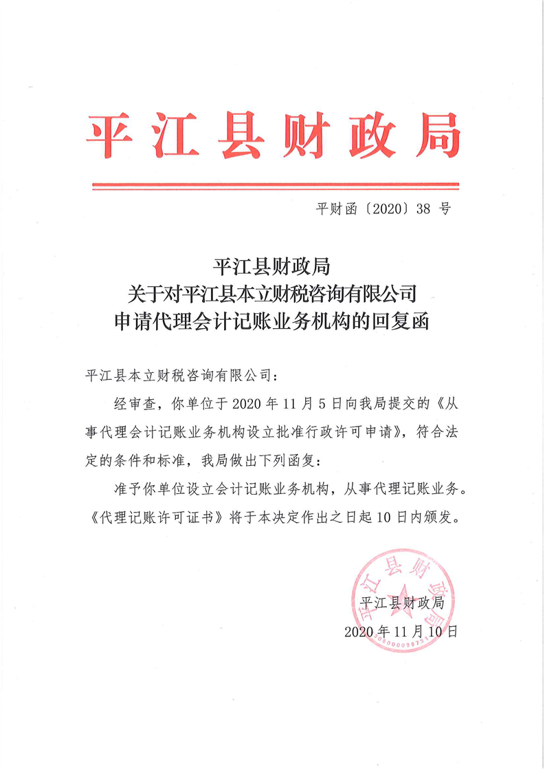 关于对平江县本立财税咨询有限公司申请代理会计记账业务机构的回复函