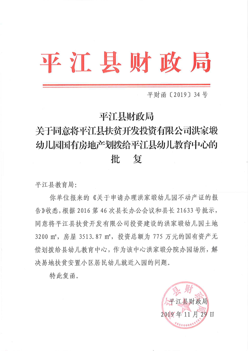 平江县财政局关于同意将平江县扶贫开发投资有限公司洪家塅幼儿园国有房地产划转给平江县幼儿教育中心的批复函