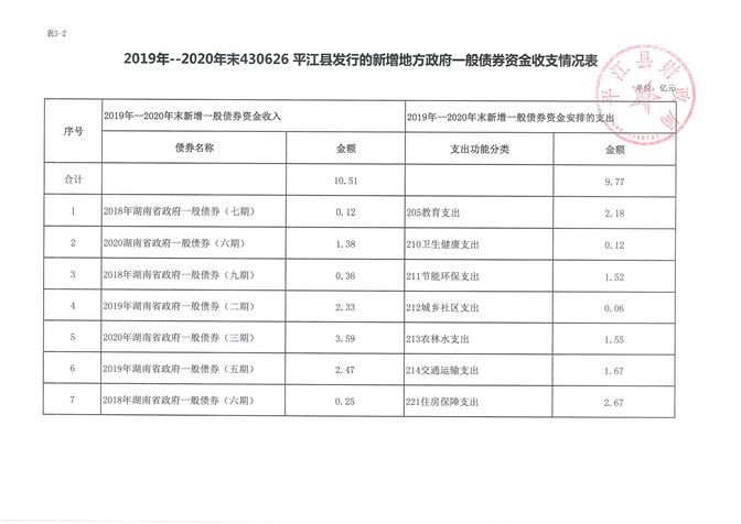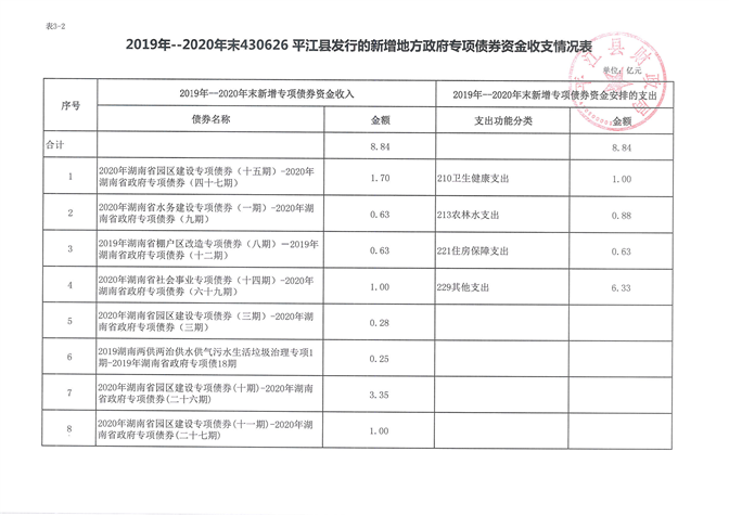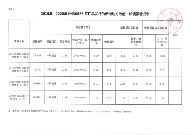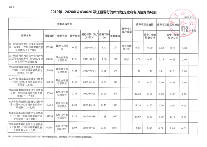 2019-2020年平江县发行的新增地方政府债券情况公示