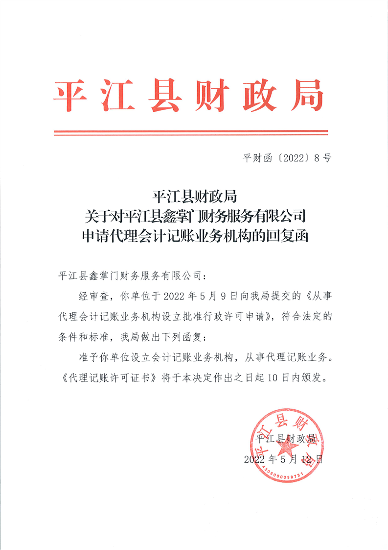 关于对平江县鑫掌门财务服务有限公司申请代理会计记账业务机构的回复函