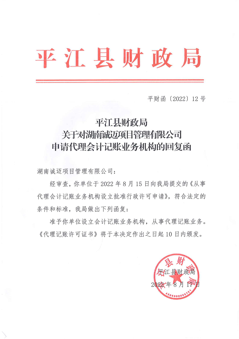 关于对湖南诚迈项目管理有限公司申请代理会计记账业务机构的回复函