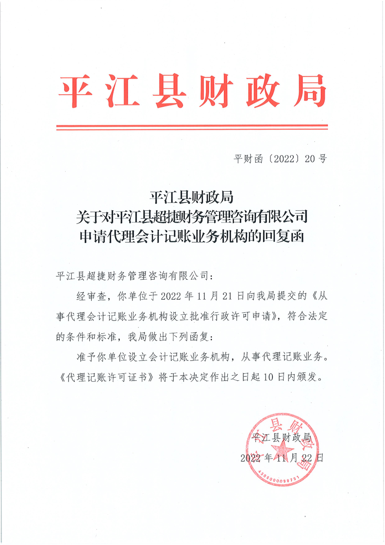 关于对平江县超捷财务管理咨询有限公司申请代理会计记账业务机构的回复函