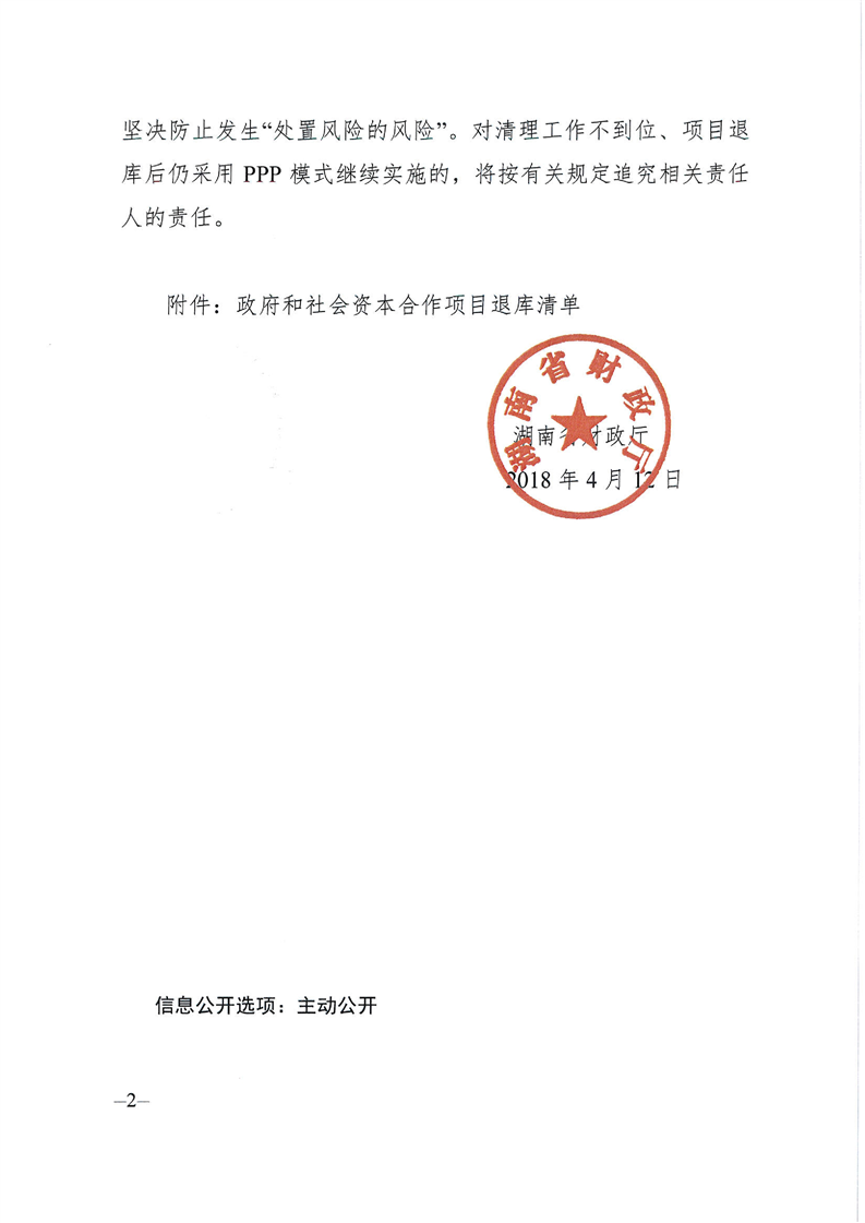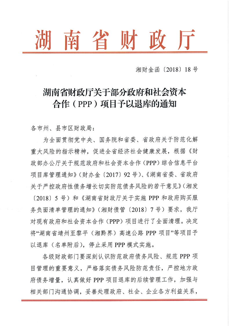 湖南省财政厅关于部分政府和社会资本合作(PPP)项目予以退库的通知