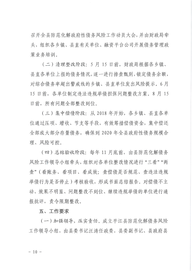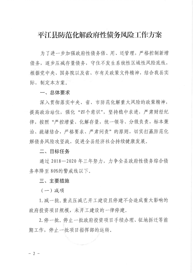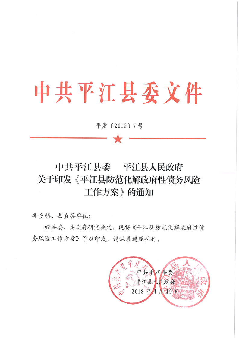 关于印发《平江县防范化解政府性债务风险工作方案》的通知