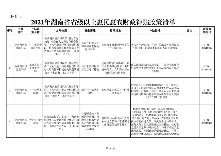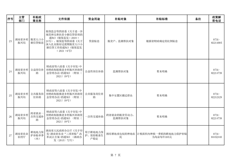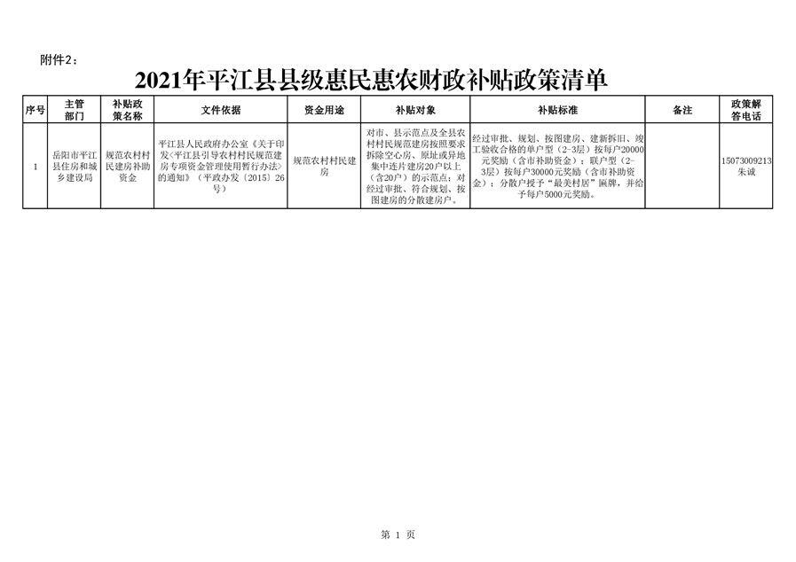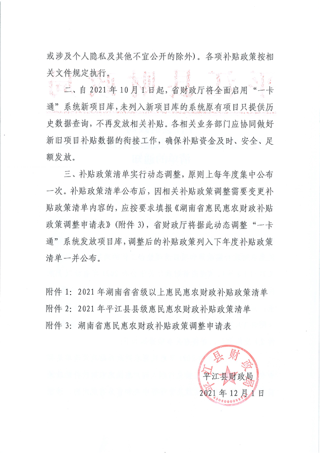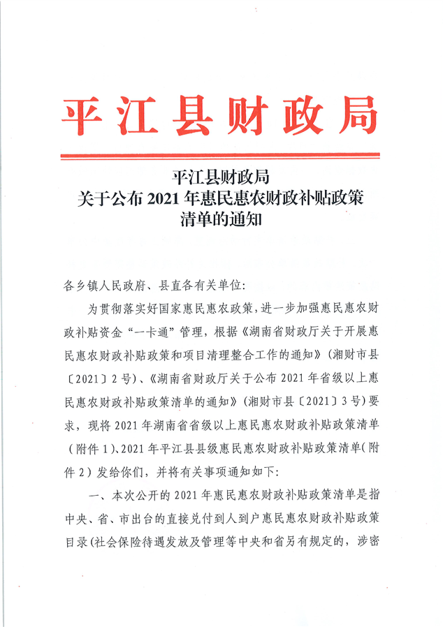平江县财政局关于公布2021年惠民惠农财政补贴政策清单的通知