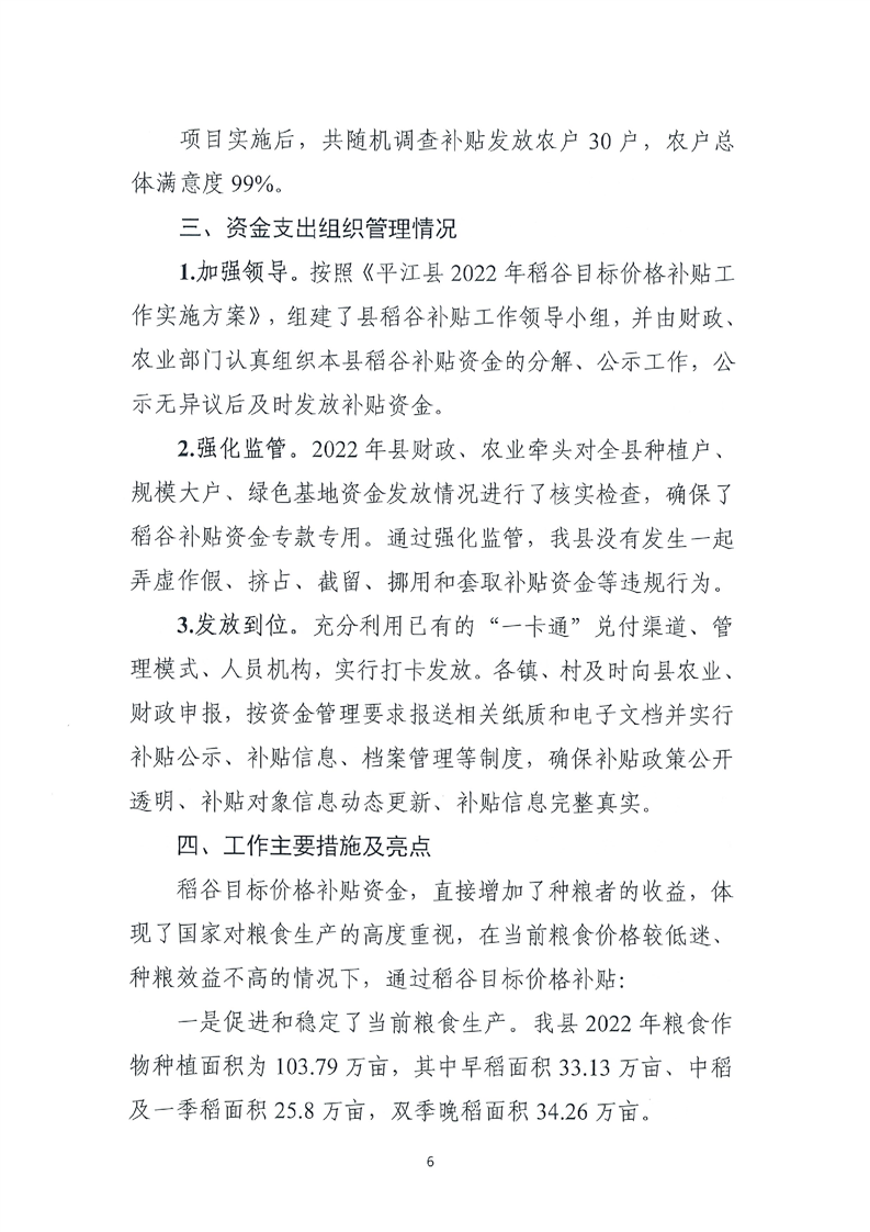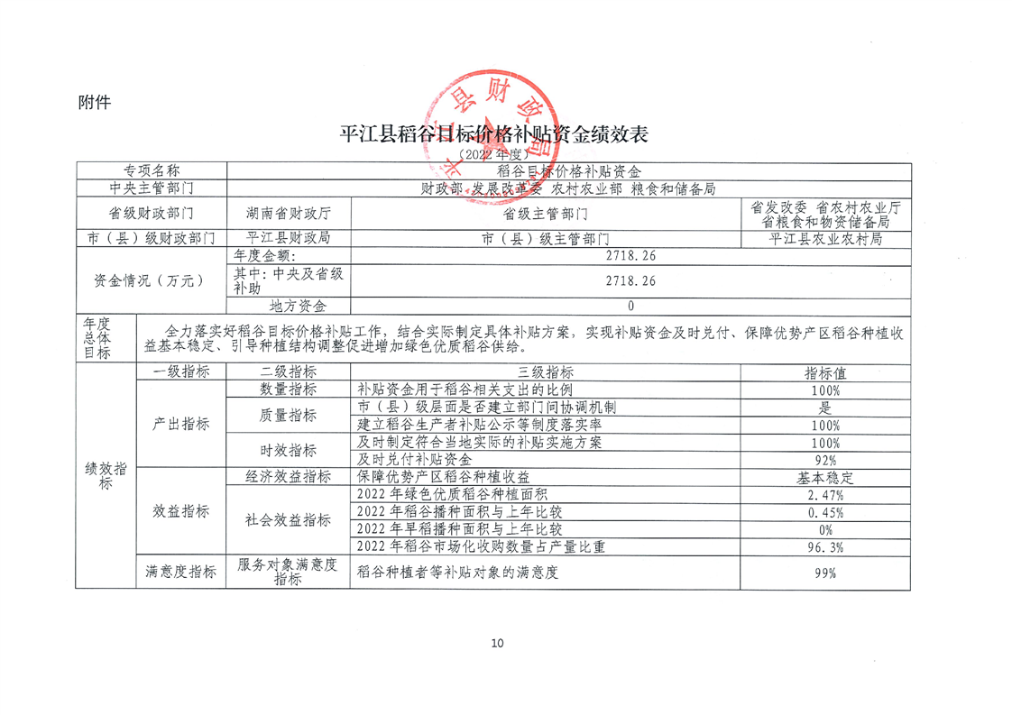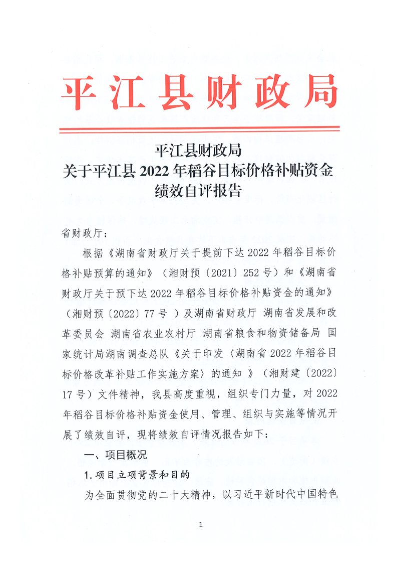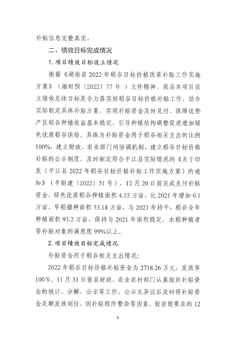 平江县财政局关于平江县2022年稻谷目标价格补贴资金绩效自评报告