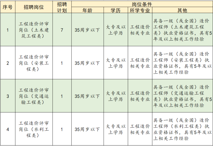 5.岗位要求的工作经历:①具有国家承认的全日制大专以上工程造价相关专业学历;②具有一级造价工程师执业资格证书;③从事工程造价或工程审计类工作5年以上,有不少于独立完成3个投资规模1000万元以上的项目工程造价或工程审计工作经验,具有良好的沟通、协调、分析判断及文字综合能力,能独立完成大型项目的概、预算和竣工结算编制及评审;④具有财政投资评审工作经历,或具有土建、安装、水利、公路等复合专业知识的注册造价师优先考虑。