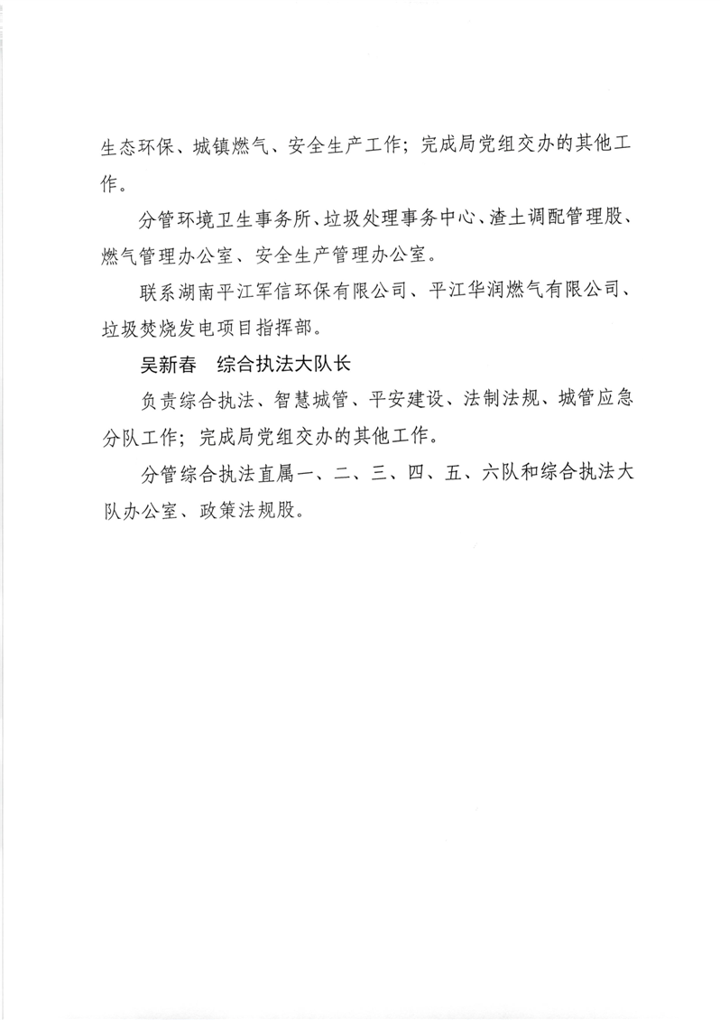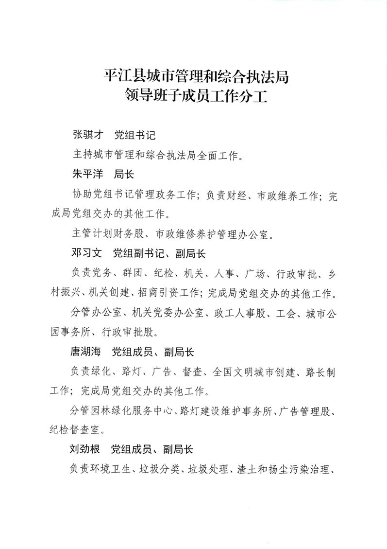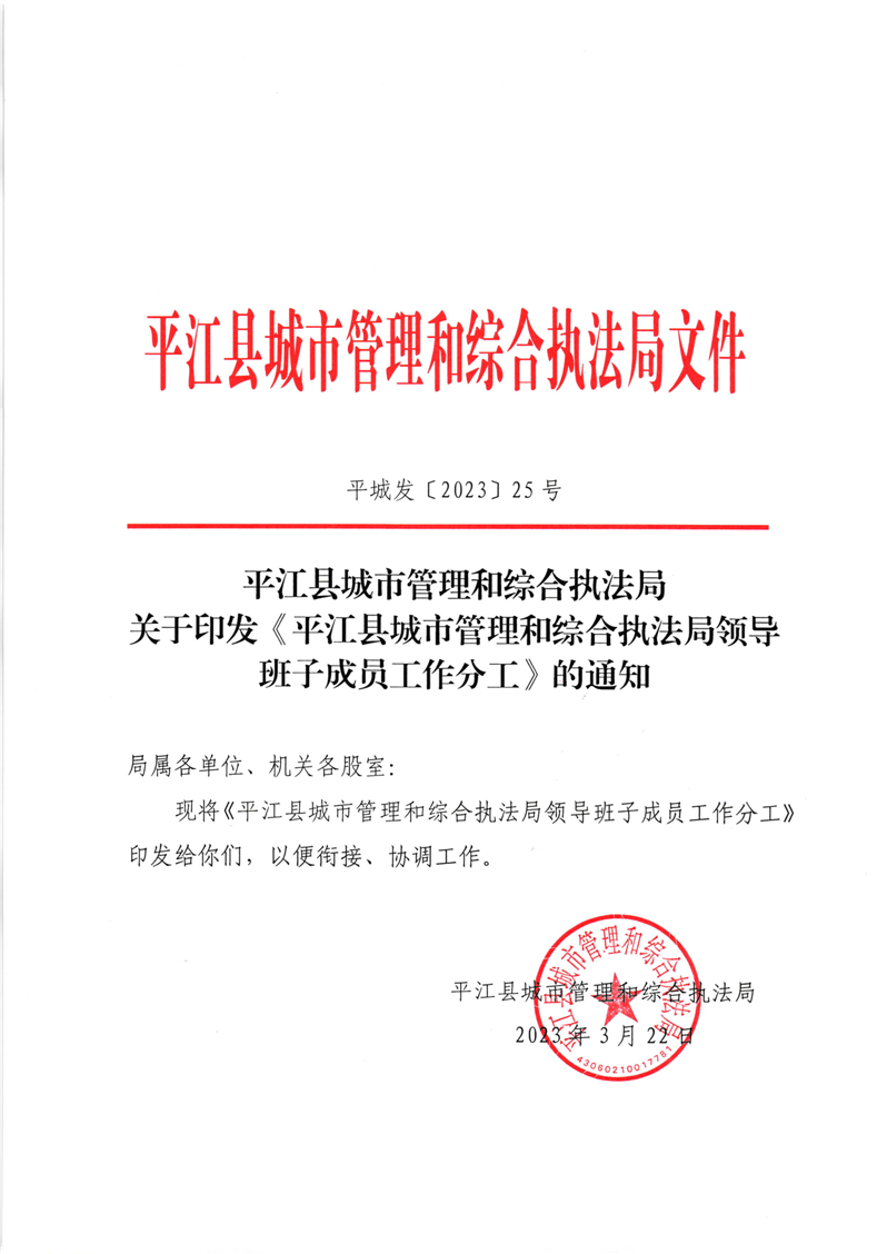 2023年关于印发《平江县城市管理和综合执法局领导班子成员工作分工》的通知