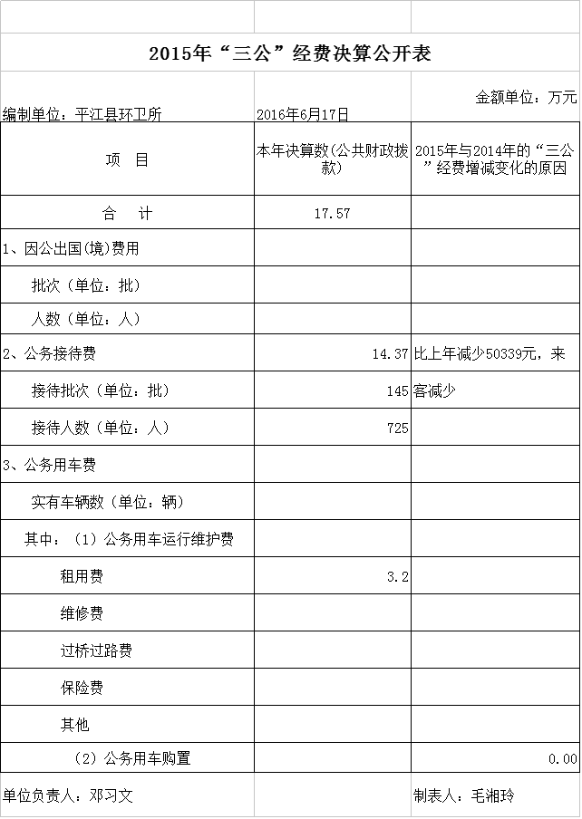 平江县环卫所2015年三公经费决算公开表