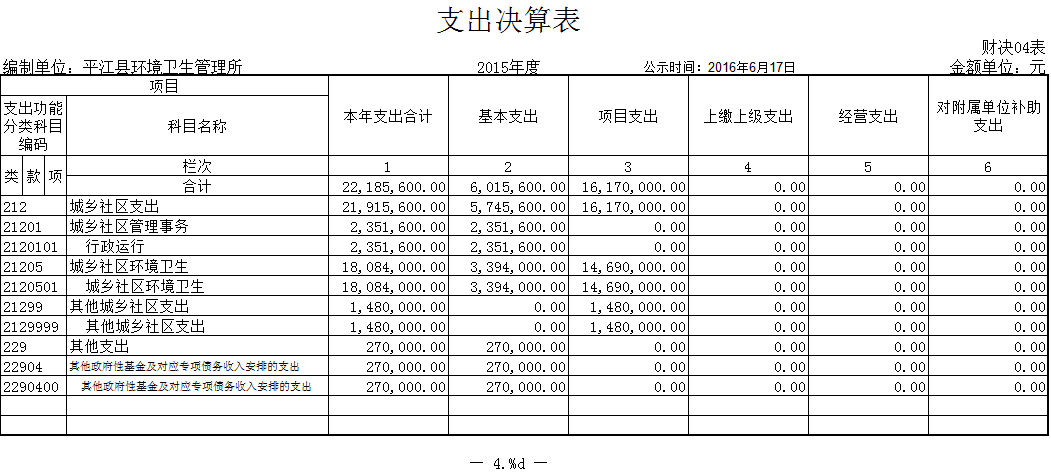 二、、项目支出决算表总支出1617万元,其他商品服务支出中,劳务费支出为967.9004万元,为一线作业长期聘用人员439人工资(城区面积逐年扩大,垃圾量逐年增加,三城同创考核要求严格,作业人员也逐年增加,清扫采用小片承包作业方式,工资比往年提高,);其他交通费用147037元为环卫车辆保险费等开支。其他资本性支出2664361元,其中1118500元为购置环卫专用车辆,82213为购置环卫专用设备,290962为办公设备 ,1172686元为办公楼修缮费用。