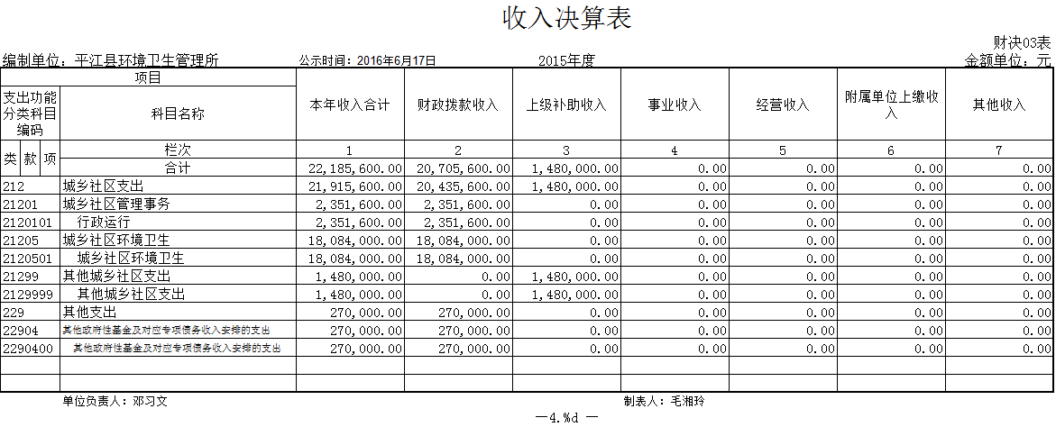 2015年年初财政预算收入为1961.15万元(行政运行174.15万元,城乡社区环境卫生1787万元),支出为1961.15万元 (其中基本支出174.15万元,项目支出1787万元),年末财政拨款收入决算数为2070.56万元(预算调整109.41万元)。