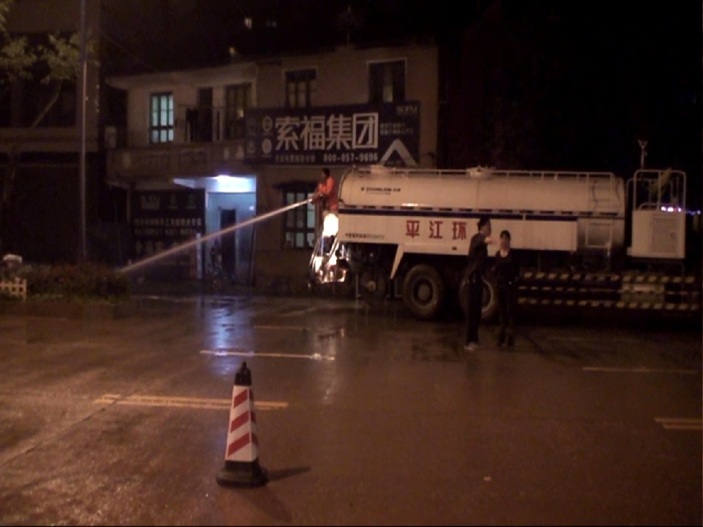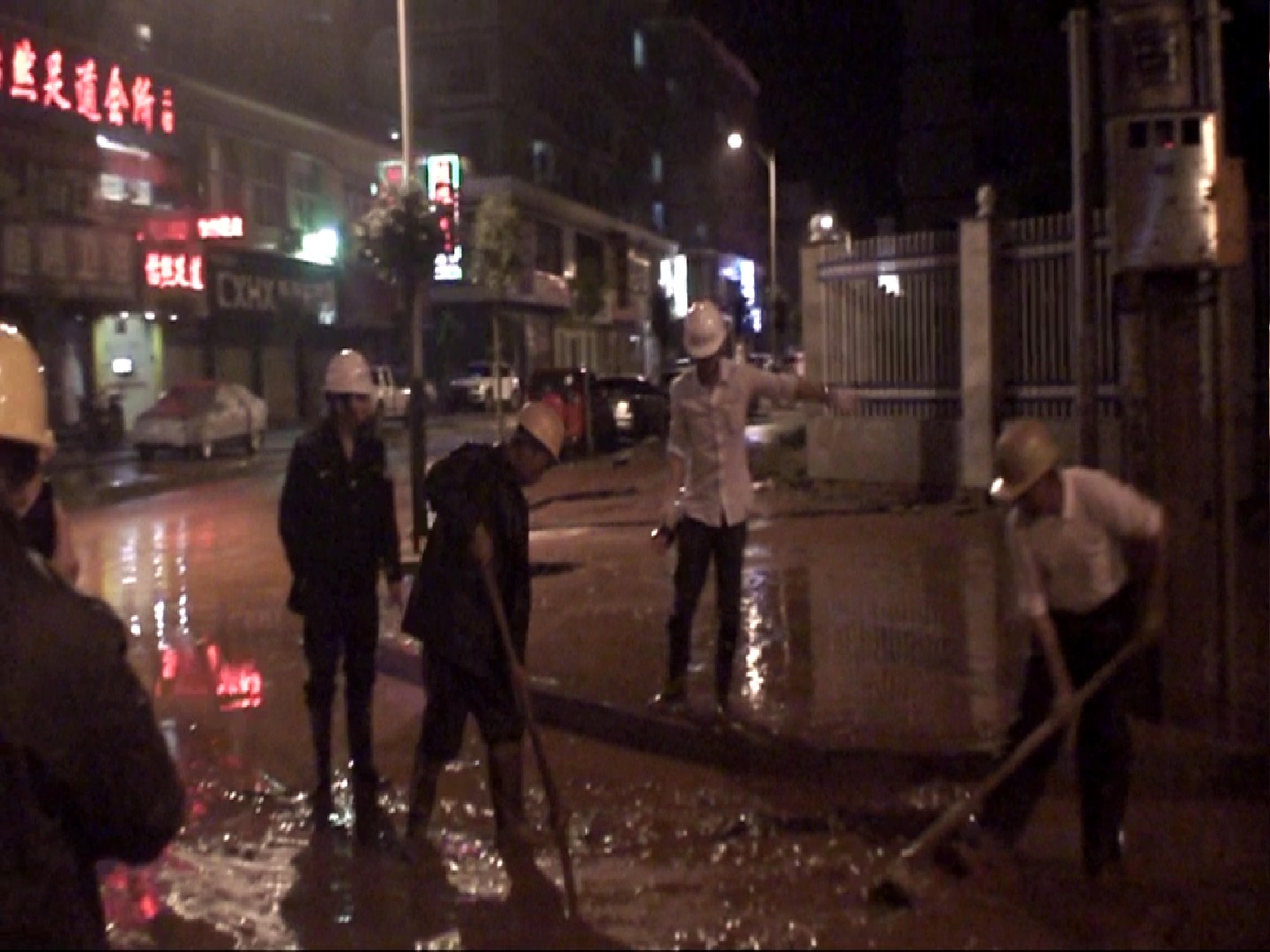 县城管局紧急启动应急预案,派遣抢险队员22人,调配洒(抽)水车2台、拖拉机2台、皮卡车2台、指挥车1台、抽水泵1台,于13:30冒雨进驻事故现场,打开排水井盖进行应急排水,并派专人值守;清掏雨水井24处,清理路面淤泥3000平米,清运淤泥20车次;帮助受灾商户抽取地下室积水,抢救受灾财产,挽回直接经济损失5万余元。晚上23:00该区域道路已恢复正常通车。