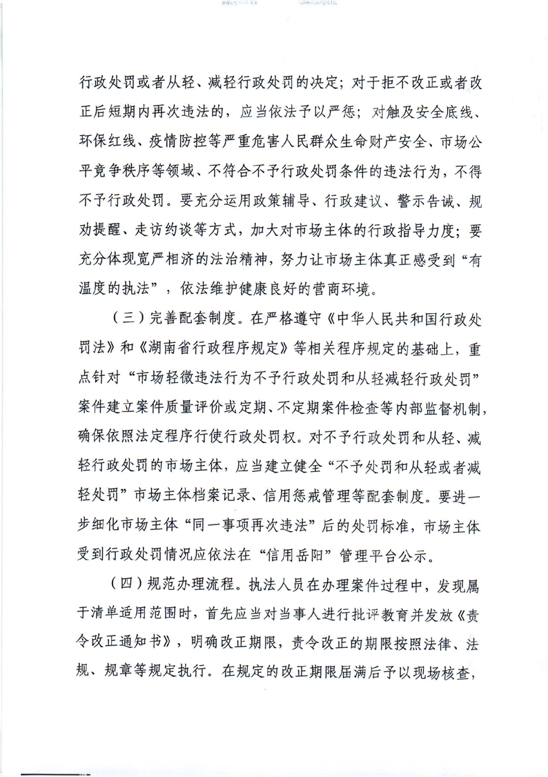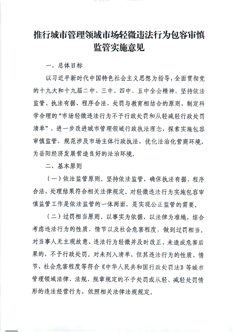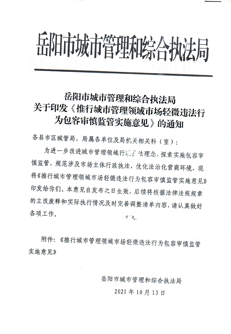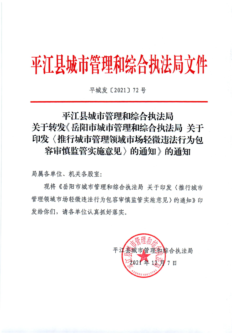 平江县城市管理和综合执法局关于转发岳阳市城市管理和综合执法局关于印发推行城市管理领域市场轻微违法行为包容审慎监管实施意见的通知