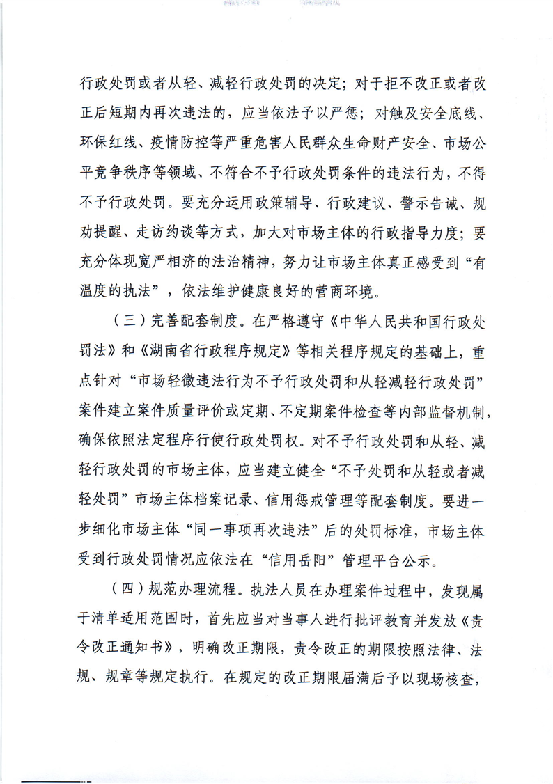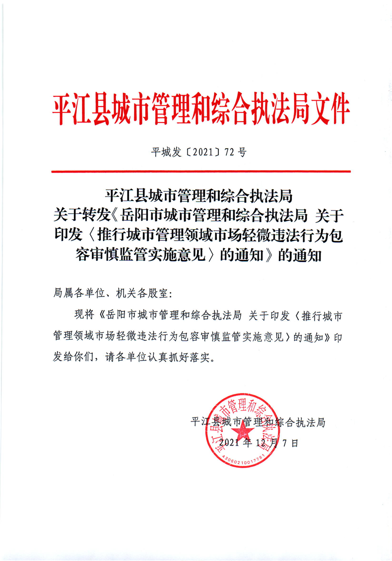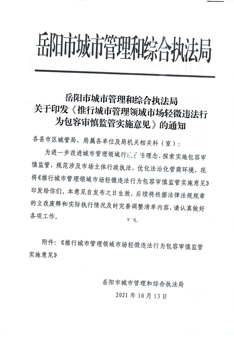 关于转发岳阳市城市管理和综合执法局关于印发推行城市管理领域市场轻微违法行为包容审慎监管实施意见