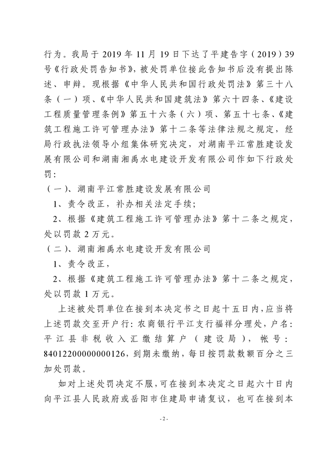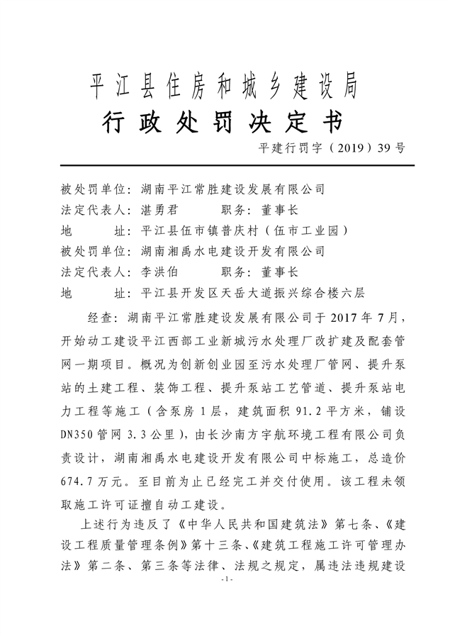 行政处罚决定书平建行罚字(2019)39号