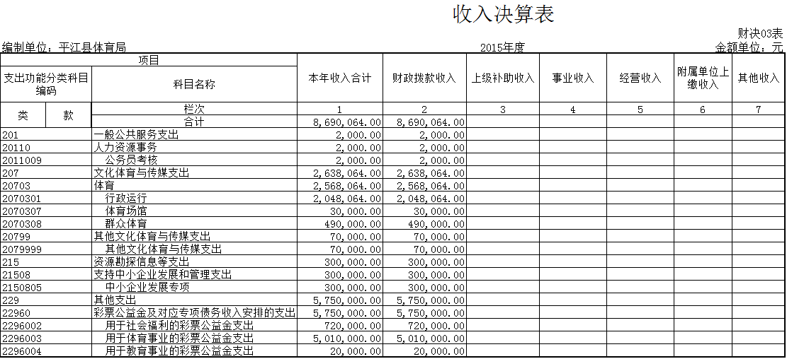 全年度总收入8690064元。其中财政拨款收入8690064,财政拨款收入各项目为:行政运行2048064元、公务员考克2000元、其他文化体育与传媒支出70000元、体育场馆30000元、群众体育490000元、用于体育事业的彩票公益金支出5010000元、用于社会福利的彩票公益金支出720000元、用于教育事业的彩票公益金支出20000元、中小企业发展专项资金300000元.
