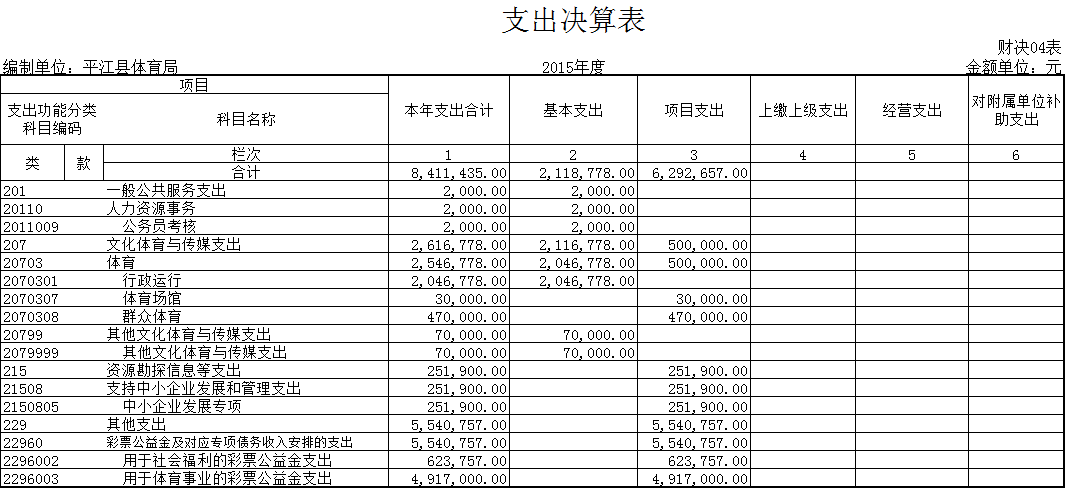 2015年体育局财政预算为2019800元,其中基本支出预算1519800元,项目支出预算500000元。财政决算为8690064元,较年初预算多6670264元.
