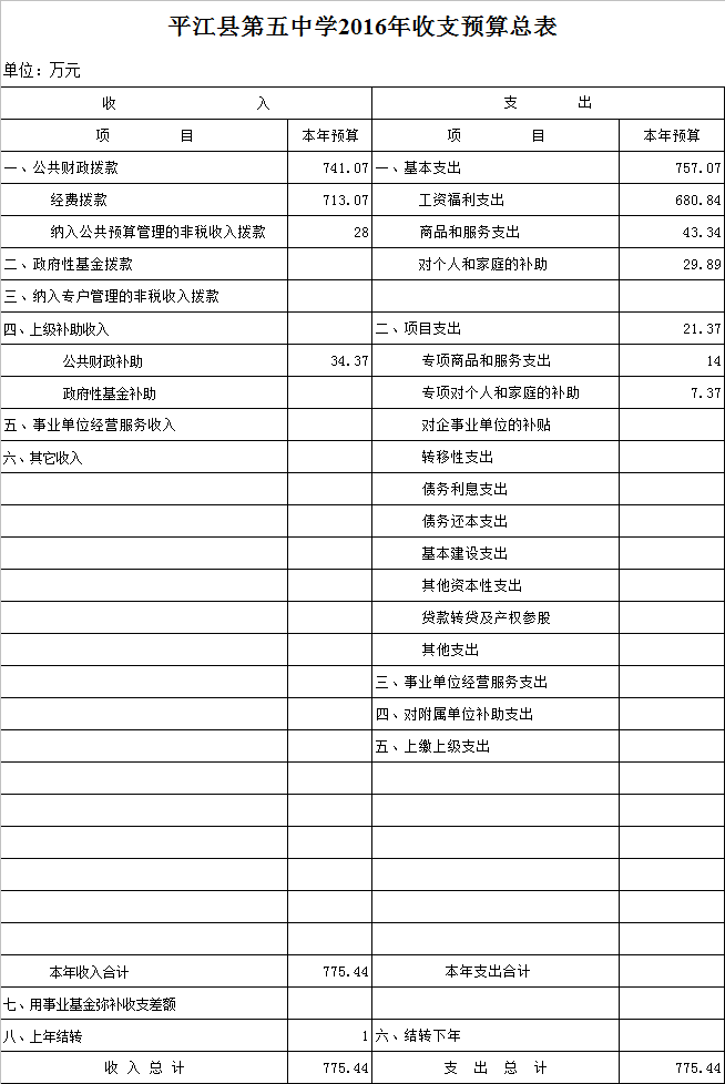 收入预算合计775.44万元,其中:公共财政拨款资金741.07万,上级补助收入34.37万元。