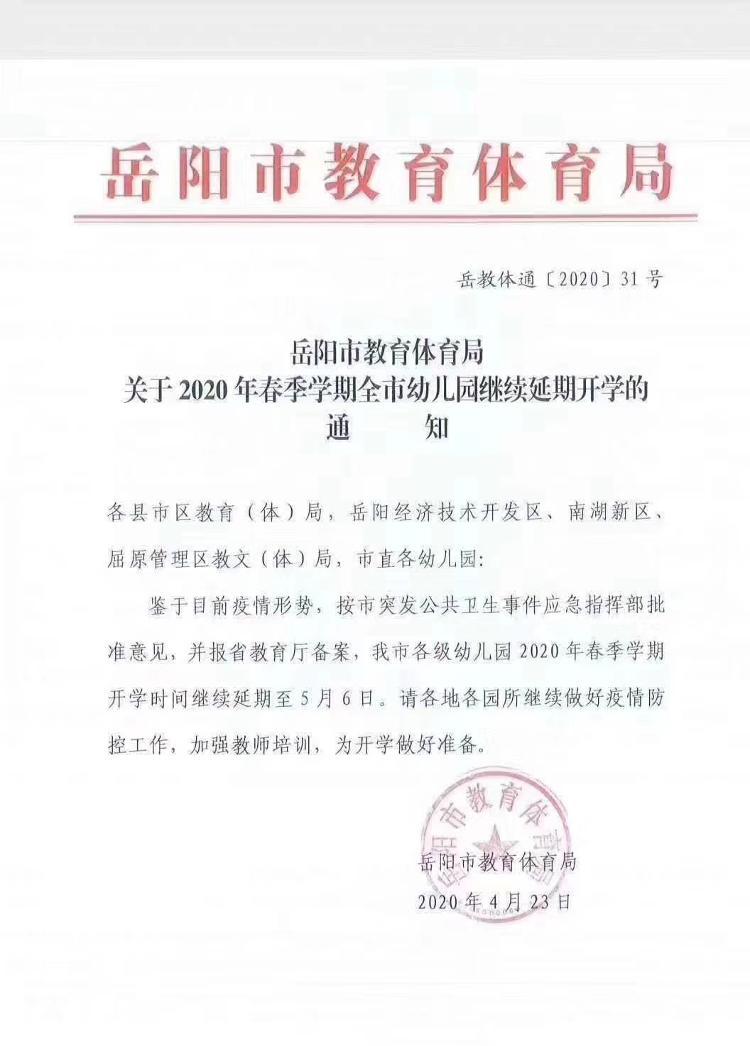 岳阳市教育体育局关于2020年春季学期全市幼儿园继续延期开学的通知