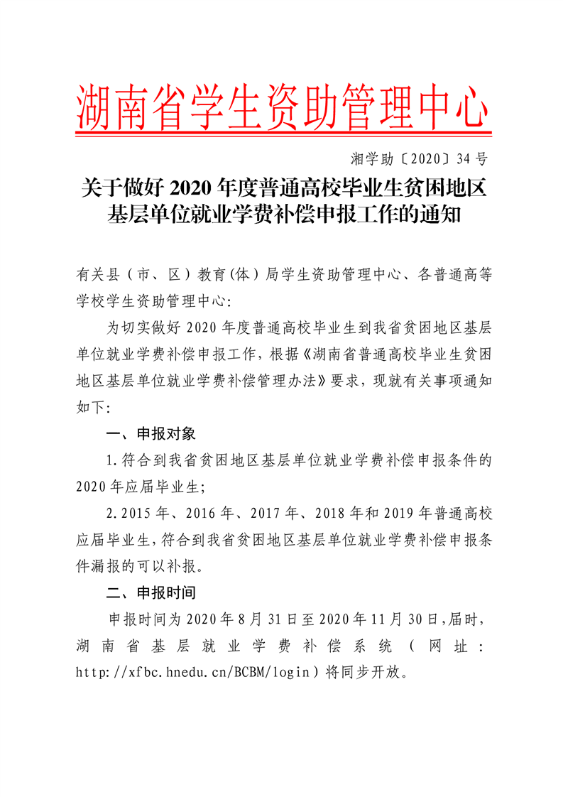 关于做好2020年度普通高校毕业生贫困地区基层单位就业学费补偿申报工作的通知