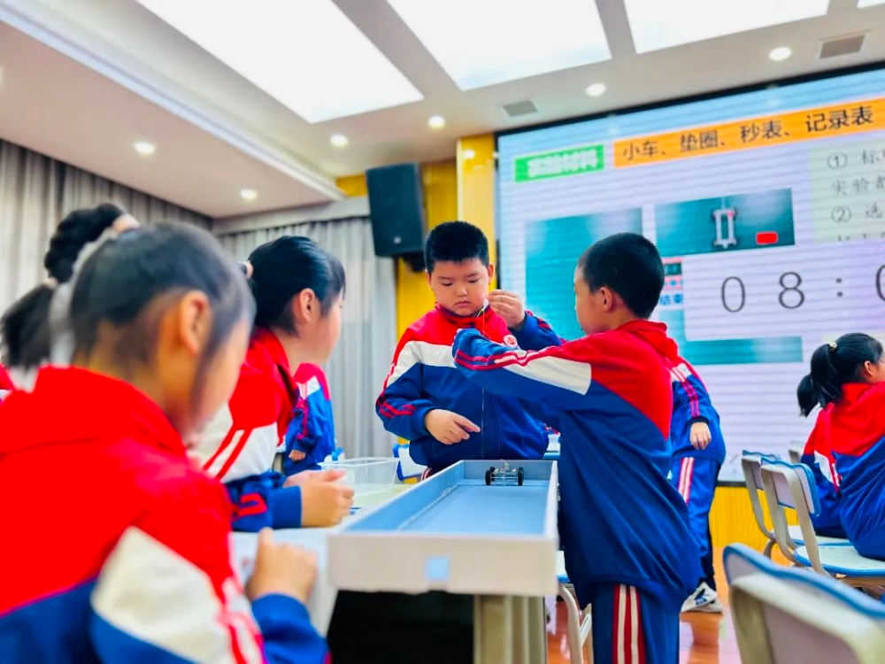 第二堂展示课是岳阳市东方红小学的殷崇斌老师带来的教科版四年级《让小车运动起来》。他带着孩子们通过实验认识到力可以改变物体的运动状态,以及研究小车运动快慢与拉力大小的关系,在轻松愉悦的氛围中,孩子们理解了小车是利用垫圈的重力运动的,同时用实验数据作为证据说明拉力大小与小车运动快慢之间的关系。