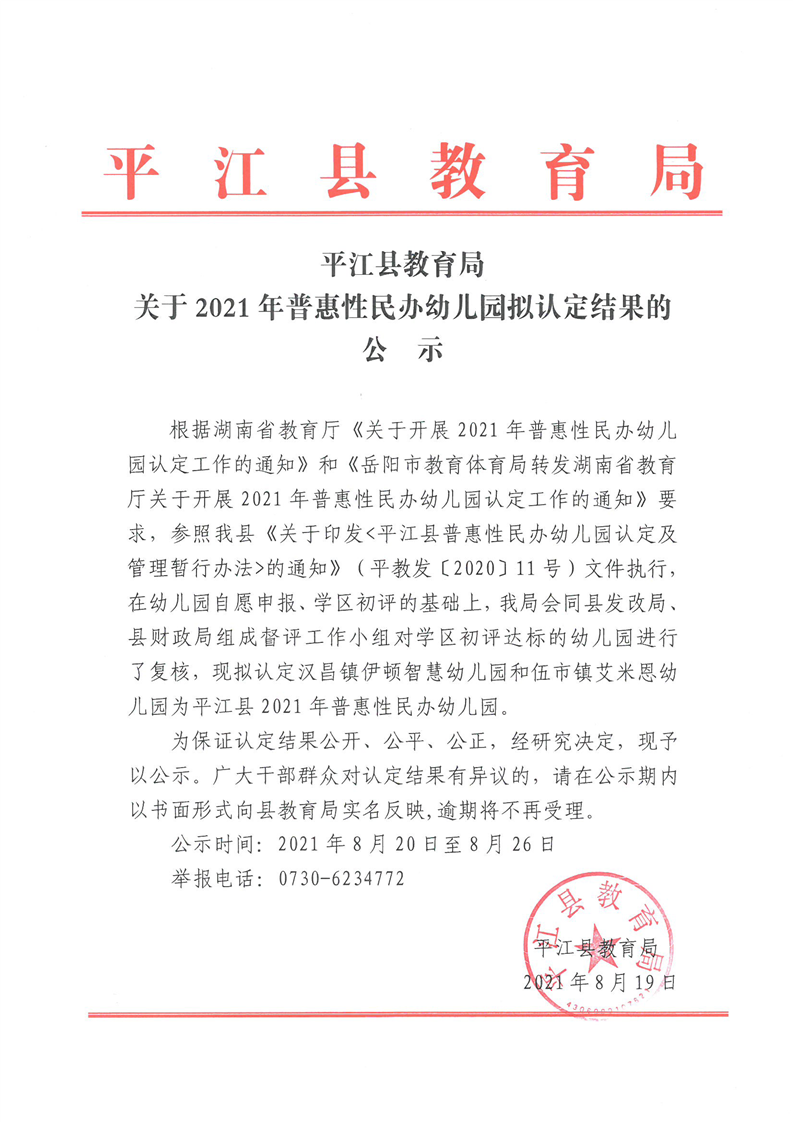 关于2021年普惠性民办幼儿园拟认定结果的公示