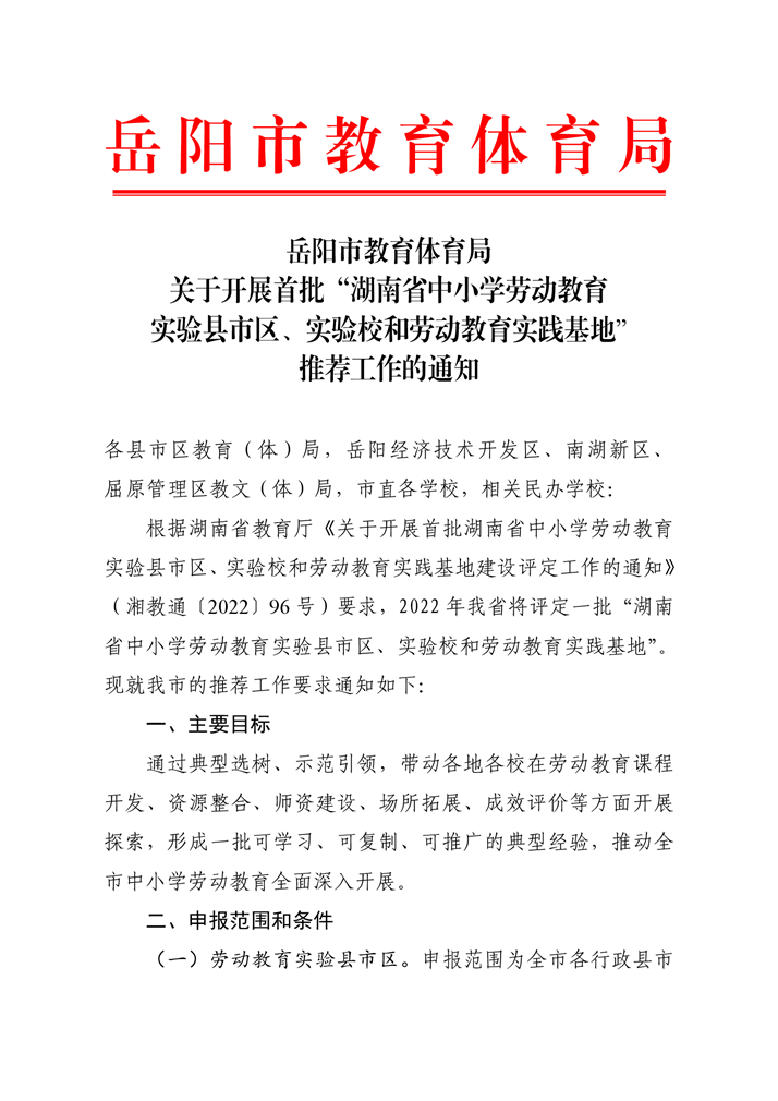 岳阳市教育体育局关于开展首批“湖南省中小学劳动教育实验县市区、实验校和劳动教育实践基地”推荐工作的通知