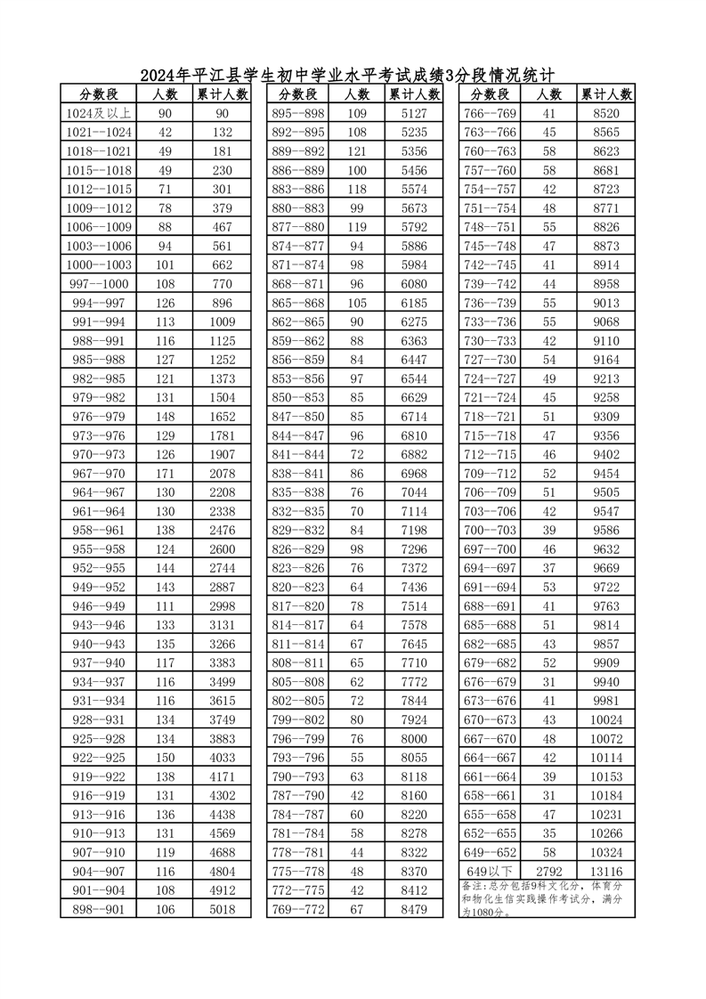 2024年平江县学生初中学业水平考试成绩3分段情况统计表
